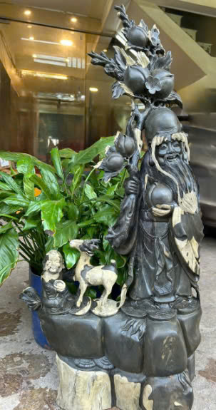 Tượng Ông Thọ gỗ mun sừng với kích thước cao 87cm, ngang 43cm, sâu 21cm là một tác phẩm nghệ thuật tinh xảo, mang đậm giá trị tâm linh và phong thủy. Được chế tác từ gỗ mun sừng quý hiếm, tượng Ông Thọ toát lên vẻ đẹp sang trọng, cổ kính với màu đen huyền bí, vân gỗ tự nhiên cuộn xoáy đẹp mắt. Đường nét chạm khắc tinh tế, tỉ mỉ, lột tả sống động hình ảnh Ông Thọ với khuôn mặt phúc hậu, nụ cười hiền từ, trán cao, râu tóc bạc phơ, tay cầm gậy trúc và quả đào tiên – biểu tượng của sức khỏe, trường thọ và sự thịnh vượng.